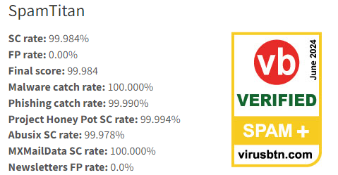 SpamTitan and PhishTitan , both powered by the same cutting-edge filtering engine, showcased their technological superiority in the latest Virus Bulletin assessment. In the Q2 virus bulletin test, the SpamTitan and PhishTitan engine recorded a phishing catch rate of 99.99%, further solidifying their position as leaders in the industry.