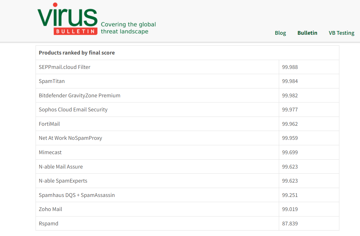 SpamTitan and PhishTitan , both powered by the same cutting-edge filtering engine, showcased their technological superiority in the latest Virus Bulletin assessment. In the Q2 virus bulletin test, the SpamTitan and PhishTitan engine recorded a phishing catch rate of 99.99%, further solidifying their position as leaders in the industry.