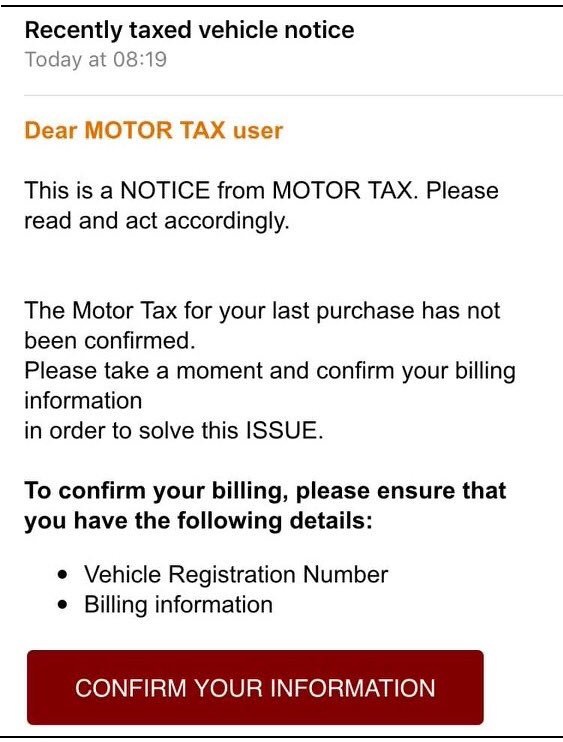 If you recently received an email like this, and provided personal information in response, the department says you should contact your bank or credit card company immediately. The Department has contacted all the relevant authorities and local motor tax offices in relation to this issue.