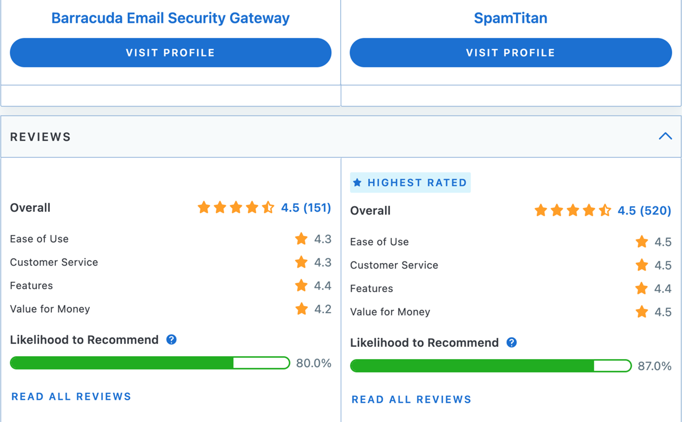 Customer reviews are a great source of external, validated feedback. Various organizations collate this feedback, including G2, Capterra, and Gartner. SpamTitan is also consistently chosen as a top alternative to Barracuda Email Security based on user experience. The example below shows how SpamTitan wins out over Barracuda.