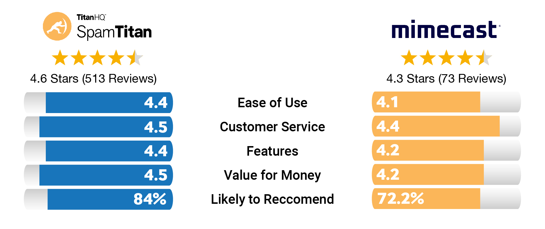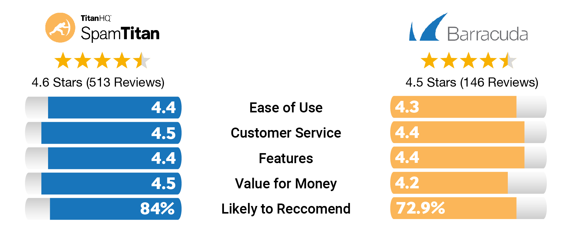 SpamTitan regularly receives excellent reviews and typically wins out over the competition. Developers for SpamTitan have a reputation for offering world-class customer support. We help you deploy the spam filtering solution should your administrators run into any hurdles. Some examples of recent studies from the trusted review site Capterra are shown below each competitor.