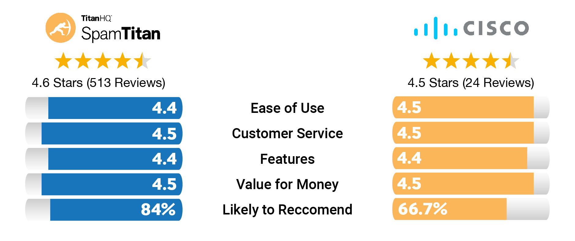 SpamTitan beats Cisco Secure Email in several areas, including the following: