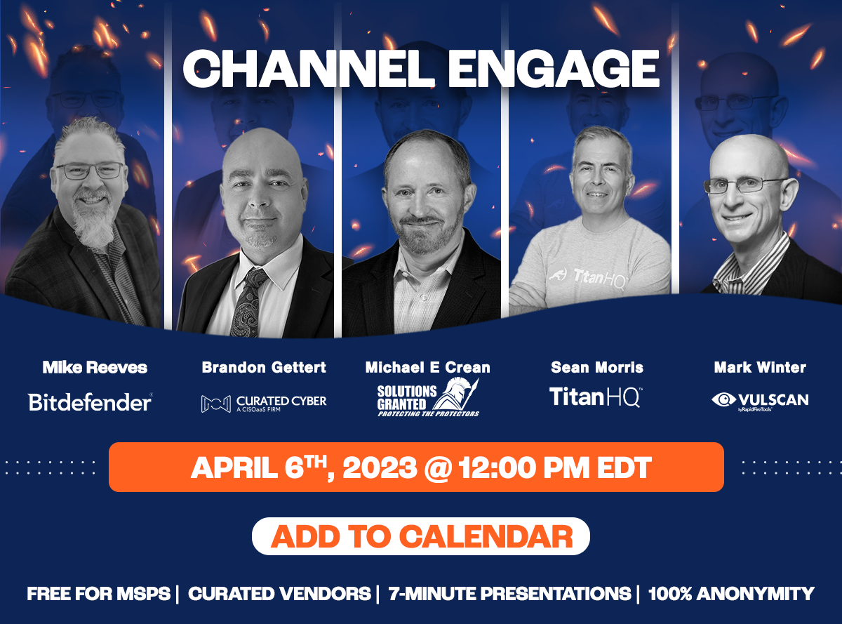 Join TitanHQs CTO, Sean Morris at the April Channel Engage, focussing on cybersecurity. TitanHQ will be joined by four other vendors to hold a LIVE product comparison.