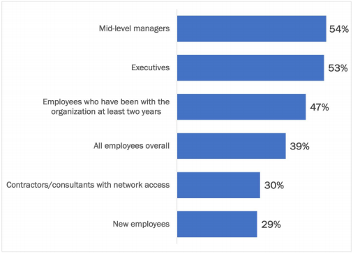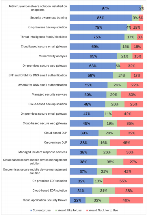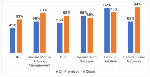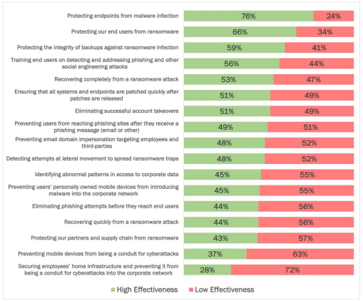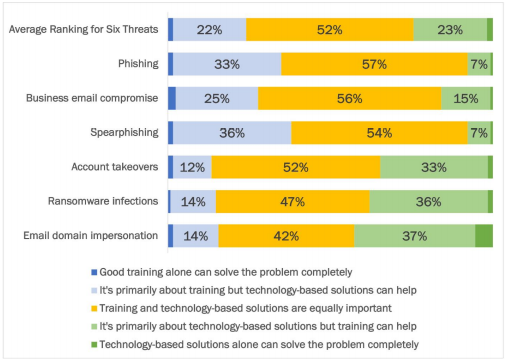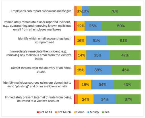 - Roughly half of respondents had a group of capabilities available for post-compromise mitigation, including remediating user-reported incidents, identifying which email account was compromised, and detecting threats after the delivery of an email attack. On average, another third said these capabilities were mainly available.