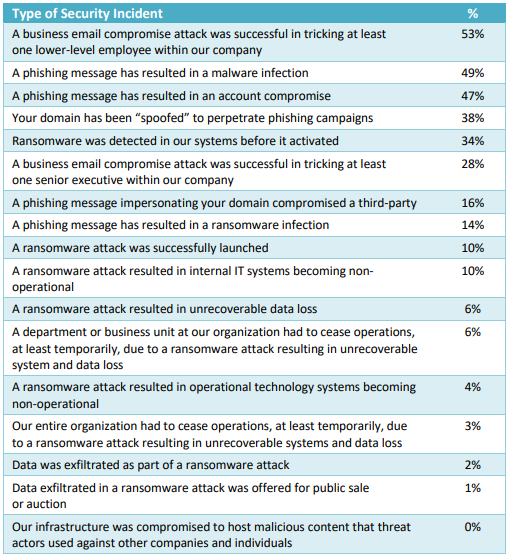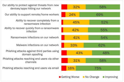 - Respondents had the lowest ability to identify internal threats that originated within their systems (e.g., internal phishing from a compromised account) and external threats that did not touch their systems (e.g., spoofing against others using their domain name). Internal phishing emails can be challenging to identify because the message and content come from within the system rather than outside. External threats that use spoofing, domain impersonation, or lookalike domains often do not touch the organization’s email infrastructure. DMARC and additional brand protection solutions, like Passive DNS, are necessary to discover these external-only threats.