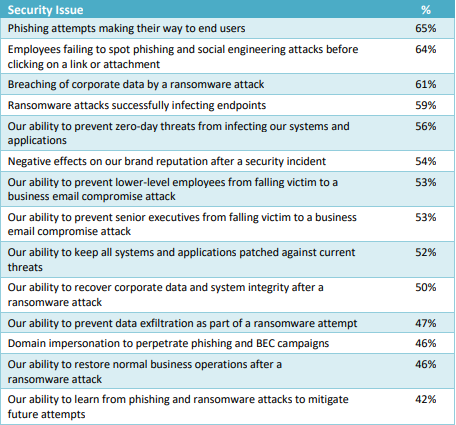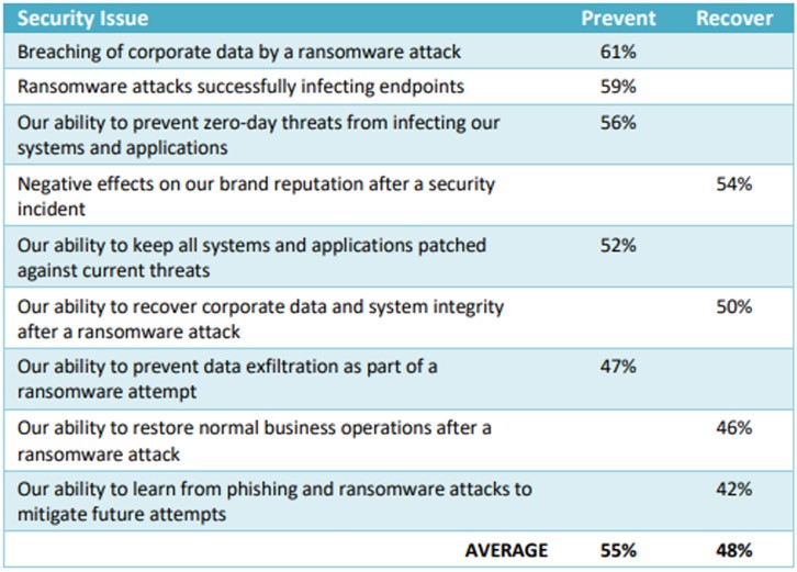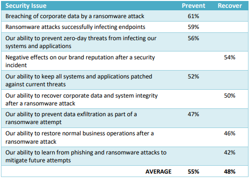 In an Osterman survey, respondents were asked to indicate a deep concern with several threats related to ransomware. The results show that more respondents are concerned about the fact of a ransomware attack than about their ability to clean up after a ransomware attack. On average, being unable to prevent an attack is of high concern to 55% of respondents. The post-attack problems, such as brand reputation impacts and the ability to recover corporate data, are, on average, of high concern to 48% of respondents.
