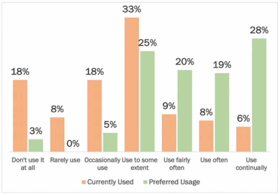 92% of respondents would prefer that AI/ML was used to some extent or more. Of the total, 47% wanted AI/ML used often or continually, up from 14% of respondents who say that is currently the situation.