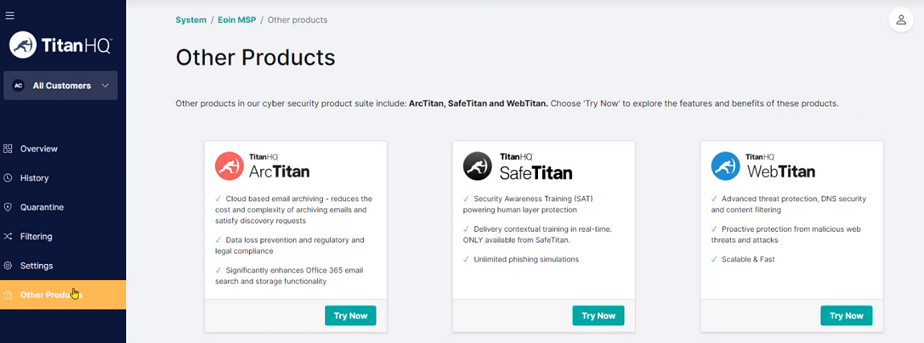 • Addition of 'Other Products' option – this feature allows MSPs to offer multiple TitanHQ solutions to their customer base effortlessly.