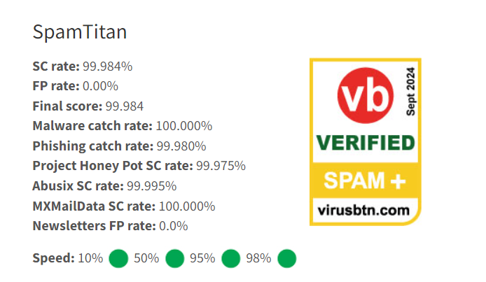 Both SpamTitan and PhishTitan, powered by the same advanced filtering engine, showcased their technological excellence in Virus Bulletin’s latest assessment. In the Q2 and Q3 test, the SpamTitan and PhishTitan engine achieved a phishing catch rate of 99.99%, further affirming their leadership in the industry.