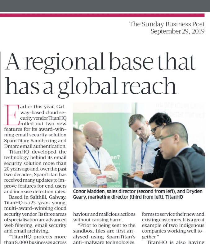 Earlier this year, Galway based company, TitanHQ rolled out two new features for its award-winning email security solution SpamTitan: Sandboxing and DMARC email authentication. TitanHQ developed the technology behind its email security solution more than 20 years ago and over the past two decades, SpamTitan has received many updates to improve features for end-users and increase detection rates.