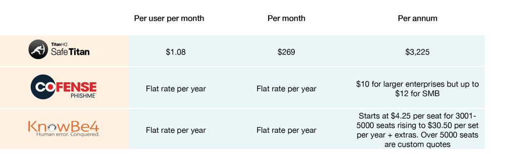 Choosing the right security awareness solution for your company is essential, but it takes much thought to select the perfect solution for your enterprise, especially if there are comparable features. However, price counts and cost-effectiveness is an essential aspect of product choice. Here is a look at the comparative costs of TitanHQ SAT and alternatives Cofense PhishMe and KnowBe4: